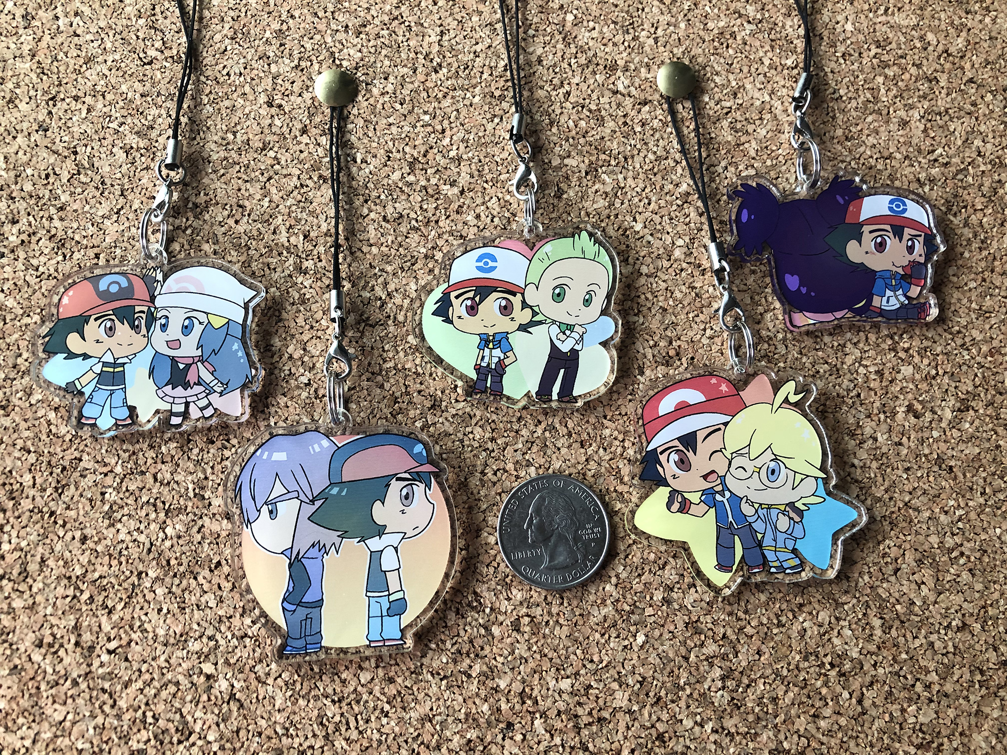 Double sided clear acrylic charms, around 1.75"-2" tall. Each comes with a phone strap.