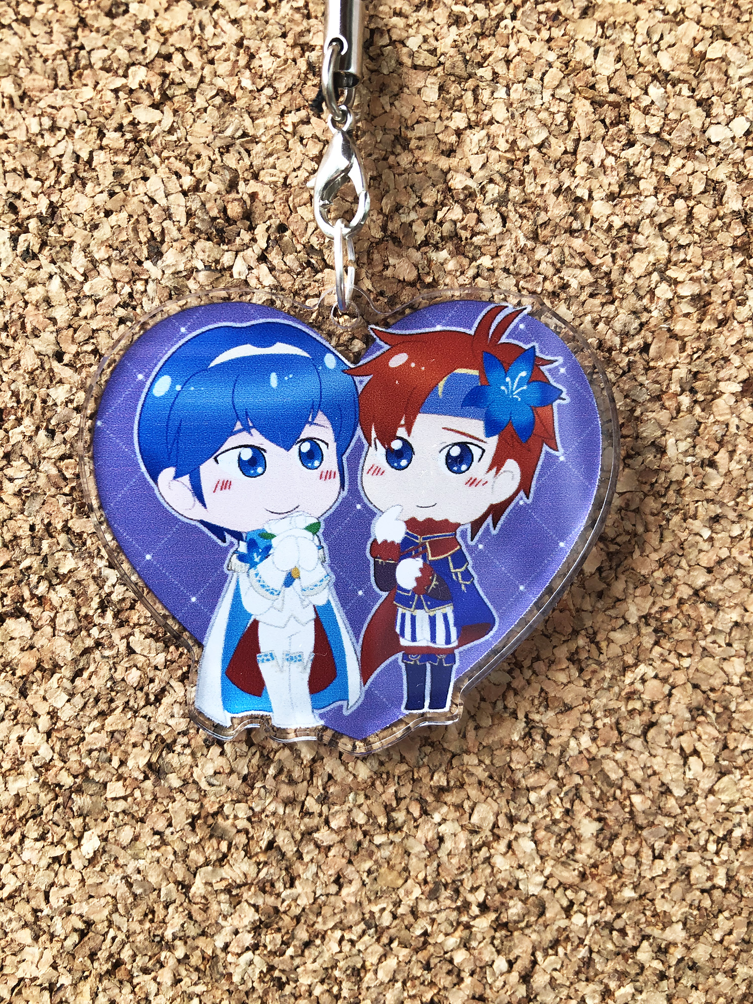 Acrylic double sides charm, around 2" in height. Comes with a phone strap.
